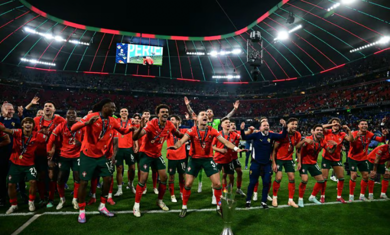 توج المنتخب البرتغالي بلقب دوري الأمم الأوروبية لكرة القدم، عقب فوزه على نظيره الإسباني بضربات الجزاء الترجيحية (5-3)، في المباراة النهائية التي جمعت بينهما، مساء اليوم الأحد، على أرضية ملعب “أليانز أرينا” بألمانيا.